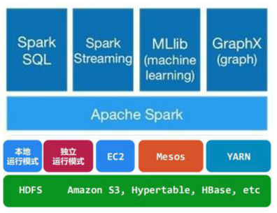 spark的上方是向用户开放的各种接口API, 下方是分布式运行的框架, 可以运行在spark本身提供的分布式运行框架上, 即以独立运行模式(Standalone)工作, 也可以借助其他的分布式框架运行, 如常见的YARN架构. 除此之外, spark也需要运行在分布式存储架构上, 如HDFS等.