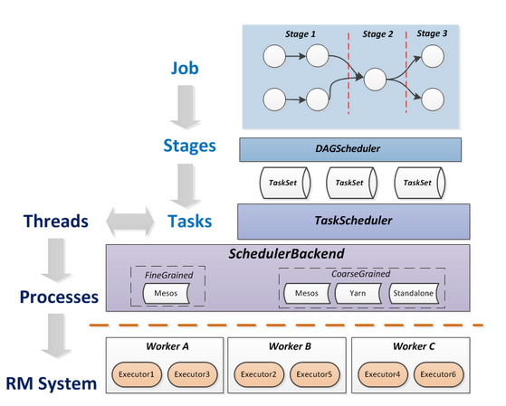 TaskScheduler: 将TaskSet交给WorkerNode运行, WorkerNode中的每个Executor运行什么Task就是在此处分配的. TaskScheduler还维护着所有Task的运行标签, 重试失败的Task.