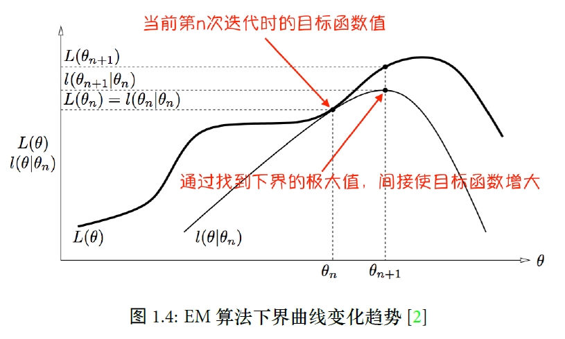 因此下一步又来到了E步, 在新的参数θ=θn+1点下, 得到隐变量的分布, 那么下界函数在θ=θn+1这一点又会与对数似然函数重叠在一起(在图中没有标出). 重复上面两步, 最后收敛时对应的参数, 就是我们需要的参数.