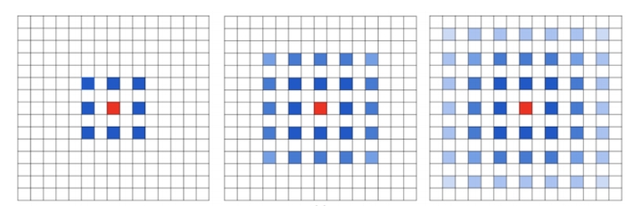 上图是多层空洞卷积核的叠加, 红色为中心, 最左侧红色中心由中心和周围的蓝色点卷积得到, 而蓝色的每个点, 又由他们本身与周围的8个点卷积得到, 也就是发散到了中间的图. 如此继续叠加, 最终红色中心的值由周围若干个点卷积得到, 如右图. 蓝色越深表示卷积权重越大.